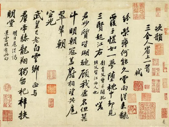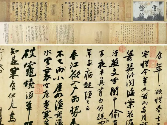 白麻纸本,28.3X306.3cm,现藏吉林省博物馆,前后总计684字,为所见苏轼传世墨迹中字数最多者。此帖乾隆时入清内府,刻入《三希堂法帖》。溥仪逊位,被辗转藏入长春伪帝宫,后散失民间。此卷前隔水、引首在散失时被人撕掉,造成残损。