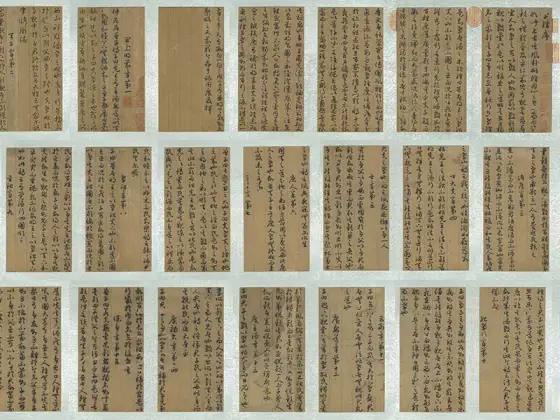 唐孫過庭書。惟聖皇之禦曆,乃承天而則大。洽至道於區中,被仁風於海外。通鳳穴以文軌,襲龍庭以冠帶。舍夷言於蒿街,陳萬物於王會。渺渺地角,悠悠嶂表。有絕域之神獸,因重譯而來擾。其所居也,岩磴深阻,盤紆絕峻。翠嶺萬重,瓊崖千仞。馬頓轡而莫外,車摧輪而不進。聚方服之君長,召積風而奉進。爾乃發烏弋,過白狼,逾絕巘,跨飛梁。越流沙而遙集,超積石而高驤。其為狀也,則筋骨糾纏,殊姿異制。闊臆修尾,勁毫柔毳。鉤爪鋸牙,藏鋒蓄銳。弭耳宛足,伺閑借勢。暨乎奮鬛舐唇,倏來忽往。瞋目電曜,發聲雷響。拉虎吞貔,裂犀分象。碎遒兕於齦齶,屈巴蛇於指掌。踐藉則林麓摧殘,哮吼則江河振蕩。是以名將假其容,高人圖其質。罄其威以淩厲,美其風而讚述。鑒倚伏以榮身,乃有識之高軌。彼白猿之騁妙,終取斃於弧矢。雖元豹之幽棲,亦捐軀於岩趾。並同亡而異術,豈行藏之足紀。何茲獸之明智,獨出處以殊倫。雖奮武以馴摯,乃知機而屈伸。去金方之僻遠,仰元風之至淳。服猜心與猛氣,遂感德以依仁。同百獸之率舞,共六擾而來馴。斯則物無定性,從化如神。譬鱗羽變質於淮海,金錫成器於陶鈞。當是時也,兆庶欣瞻,百僚嘉歎。悅聲教之遐宣,屬光華之在旦。臣載筆以叨幸,得寓目於奇玩。順文德以呈祥,乃編之於東觀。