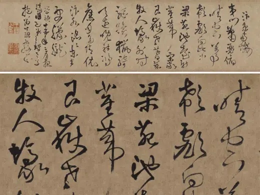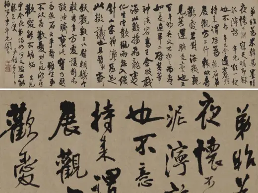 王铎《枯兰复花图跋卷》,纸本,32.6X1035.5厘米,行草书,苏州博物馆藏,清,1649年作。舒卷而精致,纵逸而蕴藉,为王铎晚年行草书之精品。