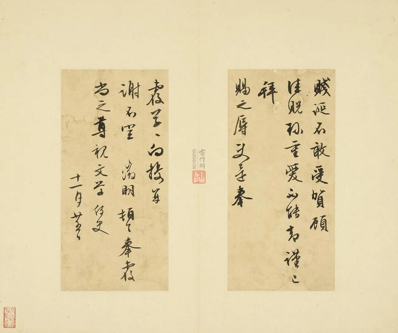 繁体釋文:向承惠問。再領佳賜。雅意勤惓。足感不忘老朽也。人還。草草敘謝。承尊恙未痊。惟佳意將節。徵明肅拜。子正賢契。八月十三日。