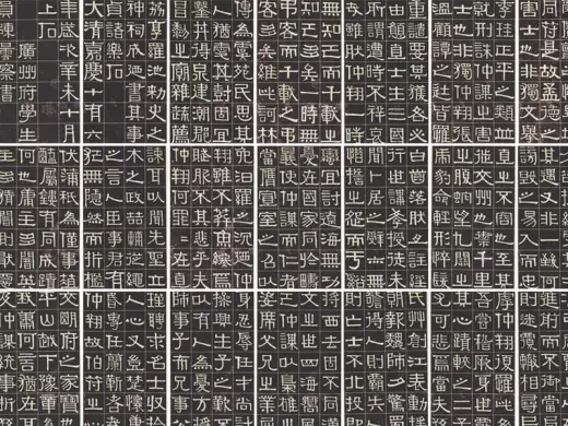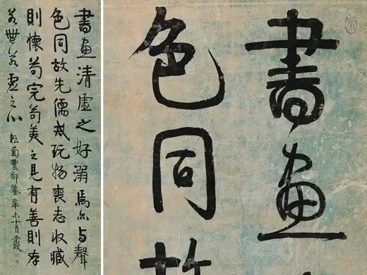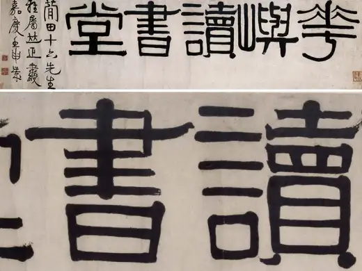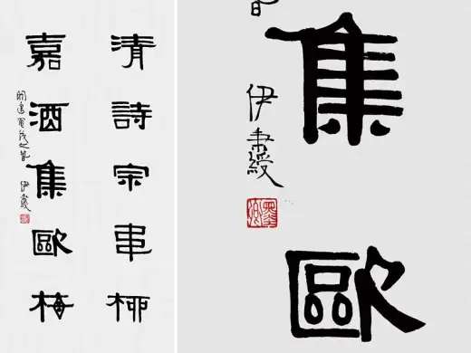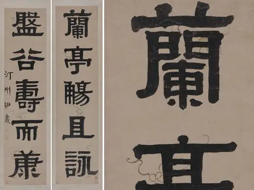在此幅作品中,伊秉绶在用笔上,笔画平直,中锋圆浑,力在中行,舍弃了汉隶中常见的波磔,即使偶见,也是意到为止。其笔画减省道只剩直线,弧线,点三种,貌似简单线条,删除了浮华繁琐的动作,却具备了朴实敦厚,古拙率直道德特点。然为了避免单一运笔所导致的呆滞,伊秉绶在线条上,采取了线条长短不同,曲直穿插,参差错落,枯润相间的方法来活泼字形。在字形上,其将汉隶原本扁平的形状改造,注重字内架构与字外空间的精心策划,笔画主次,长短,揖让的处理,增加了字内空间的趣味性。其在结体上大胆挪动,在布白上巧妙借让,故能达到疏可走马,密不透风的奇险效果。其字平正而不刻板,厚重而不灵巧,变化而又富有情致的处理方法,与现代艺术构成原理有暗合之妙。在气息上,伊秉绶深受颜真卿的影响,颜书得圆浑厚实,在本质上是隶书方法写楷书,按米芾的说法,颜书有“篆籀气”,伊秉绶深知这一点,且颜书得正大气适合写榜书,这对其拓展自己气局有很大的好处。其将颜楷与其自己的隶书相结合,与汉魏风骨相互磨合,深化无间,自然天成。