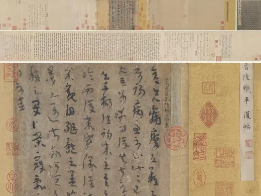 晋陆机平复帖。(行书)。彦先羸瘵。恐难平复。往属初病。虑不止此。此已为庆。承大(一释「使」)唯男。幸为复失前忧耳。吴子杨往初来主。吾不能尽。临西复来。威仪详跱。举动成观。自躯体之美也。思识□量之迈前。势所更有。宜□称之。夏□荣寇乱之际。闻问不悉。(草书)。