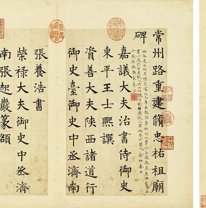 常州路重建脩忠祐祖庙碑。嘉议大夫治书侍御史东平王士熙撰。资善大夫陕西诸道行御史台御史中丞济南张养浩书。荣禄大夫御史中丞济南张起岩篆额。宇宙间伟人出。而动荡一世。揽龙虎。鳄蛇虎。啸风云。洗日月。使国去祸。使民就福。此皆天神来为世人。故能挈造化。在手成大事业。及其形化。返于虚无。则复为神。固其所也。翘风芳历。勍勋醲泽。不亡于千古。遗纪于一时。顾或有之。许浑尝叹卫将军矣。今毗陵所事陈真君。有妫之后。盖擢高科。仕随大司徒。拯危平僭。以忠著。其佐神柴侯。仕南唐节度使。皆能摧敌。以义以勇名。夫官大司徒。节度使。不贱。忠义有勇。又立名当时。随五代史亦莫之及。及亦莫之详焉。因知古名臣烈士。史失其姓名与事者何限。公论一人心。人心一天理。忠义人心理也。无有泯时。况其使国去祸。使民就福。无异其平生哉。水旱也。雨旸之。盗贼也。钱镈之。疾病也。箪食肉之。休赖天下。而祀盛淮浙东西。毗陵为神桑梓。尤甚盛。郡之人奉之。灵动畏。视之神。恩动爱。视之父母。庙以寓归依之心。表白忠祐。而爵王至帝。封福顺武烈。显灵昭德号。旧也。熙朝嘉阴相之绩。帝之上。无能名。益仁惠孚祐。是锡真君。帝。通天人之辞。真君天之矣。然号高而庙庳。弗类。初郡长脱因公祈榖稔思报。缮脩有开。以蕲众是助。公拱手言。神忠义士。于名教有益。且吾民何恃。身康而腹无饥。匪他之赐。神殆与牧守分治此郡。吾坐官署安。神风雨不庇。愧之久矣。安事劳民。旦出私钱。率僚属。凡营具图。殿几。门几。厢庑几。亭台几。殿某。门某。厢庑某。亭台某。具式。木务大。瓦务重。竹苇铁灰甓石胶□漆务坚。其崇务充。其纵横务深广。有志也。工未半。以报政去。及锡命下。赵君崎尹武进。愿合以培。同知明安海牙公继至。虔倍之。主祠二张师。叩囊底以从。遂成。成契图式。殿大小六。厢庑左右夹门内外二。亭台前后捴百楹。斋房宾馆。厩库庖湢在其外。凝土像形。严形像秩。凡焕饰无不萃。于是林泉改观。过者愕眙。昔者重幡垂拥。游埃未远。今则飞楯躐廉。高褰大辟。清思拔出。昔者瓣香俯伏。地不给序。今则虚唐荫术。列容千席。进退有馀。红衣羽扇。俨临于表。皓乎莲华涌太华也。金戈玉节。森植于下。凛乎瑶树行碧海也。至若声容堂堂。如顾盼然。威耀奕奕。如指挥然。隐若雷霆下青天也。故庙成。神益尊。人敬益新。而大号之美始称。师请昭其事以勗方来。余为之一书曰。圣元太子在上。百灵效职。继自今日。太平万亿世。与天无极。再书曰。陈真君迨其佐柴侯。血食乡土。为国为民。继自今日。国加卫。民加保。与圣世无极。三书曰。毗陵入混壹来。第一甲子。实维景运。是岁神新庙克具。实维盛事。继自今日。庙如吏治有府。如民处有室。与神釐无极。繄毗陵之人。艾耄期颐。至而曾玄。在乐国亦无极。书已振动。拜为诗以系之。明年。宇下怀椒糈。烝蕙肴。夕用迎亯。送以备焉。真人弃羊去邓墟。御风泠然行八区。返顾下土瓜烂蛆。哀时再出忘隆污。银河倒流落蟾蜍。海内惊见明月珠。策治未数谊及舒。盛德要矢皋陶谟。随家山川如画图。端坐正之不崎岖。锄乐刬娄一轩须。士休而歌法兴屠。归从放勋谒帝趋。愿脱秽浊陪清都。金尾狮前若声俞。天上虽乐无闲夫。神仙皆起功行殊。命使永泽江南枯。畏垒俎豆千年馀。至竟膻行生橛株。光灵所被非一隅。是邦迺自诞弥初。春风箫鼓花氍毹。秋风鸡豚稻香腴。桥运相使巧中输。侯谁在矣柴与俱。渺州之西松偃湖。义兴英挺白额菟。近州之东泉溜渠。九龙孤高雨芽炉。致功避世各足须。䜩游有客适有居。君不寂寞少此娱。赤鲤既来毋疾驱。留伴亭鼋栖接余。日听闾里歌唐虞。崇道凝真通妙法师。玄学讲师教门高士。常州路玄妙观住持提点。兼领本路诸宫观事张继宗。明道弘妙法师。常州路忠祐祖庙住持提学(圈去)举张绍先立石。
