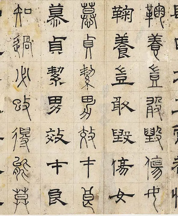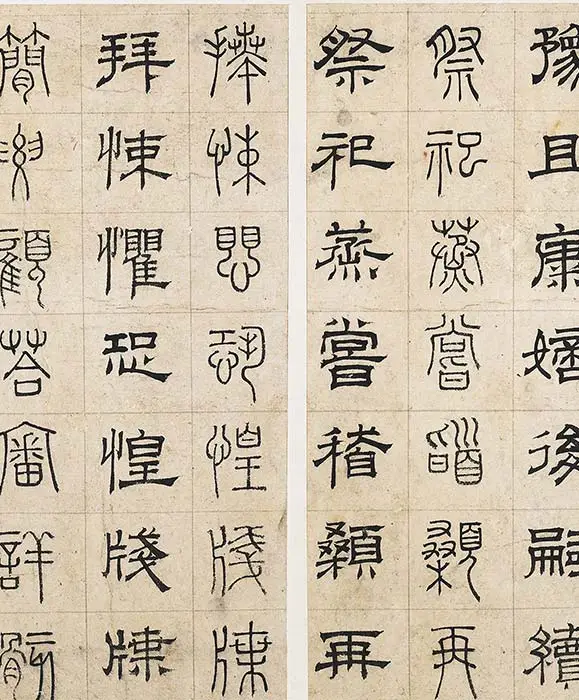 本册以篆、隶隔行并排书成,除了方便识读外,也呈现了不同书体的美感。篆书的结体修长坚实,线条瘦硬挺拔,隶书结字方阔,用笔严谨整饬,风格优雅。