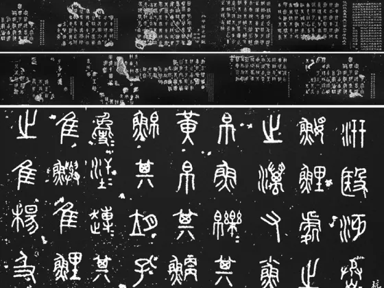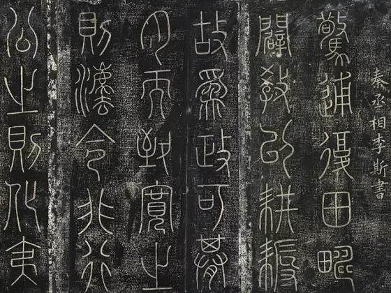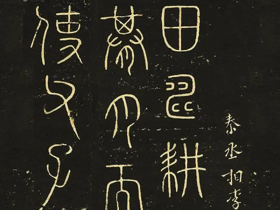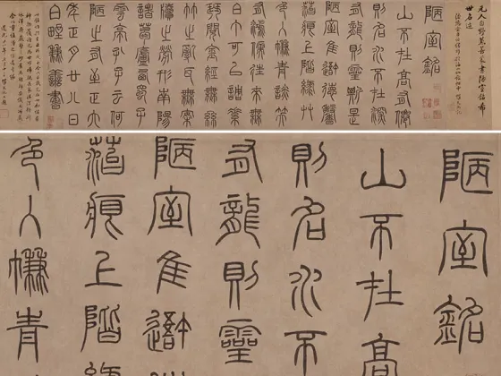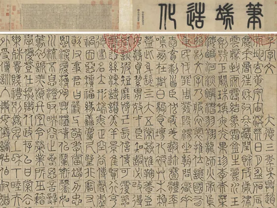 ——北宋,章友直,步辇图题记,绢本,篆书,北京故宫博物院藏。北宋学者章伯益为其撰文《步辇图》并采用小篆所书写,记述了唐太宗召见吐蕃使臣禄东赞的经过。