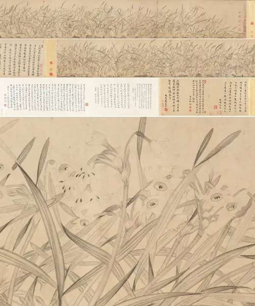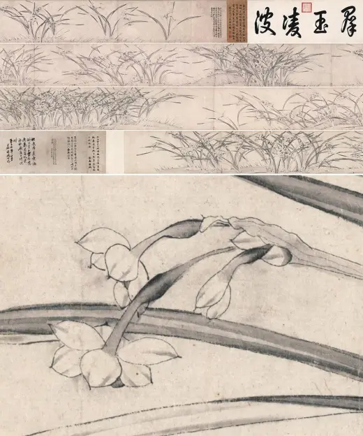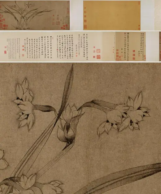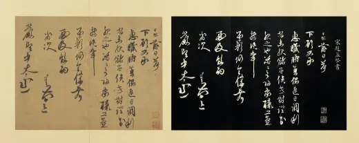 赵孟坚(西元1199-约1264年),字子固,号彝斋居士。浙江吴兴人,宋之宗室,宝庆二年(1226)进士,景定初年为翰林学士承旨,入元不仕,修雅博识,善画,工诗文,酷嗜法书,多收金石法帖,每泛舟漫游,舟中备琴酒书画,吟诗赏玩,世人喻为书画舫。尝得姜蘷旧藏定武兰亭,过霅之弁山,风作舟覆,子固入水惟救此帖,谓性命可轻,至宝是保,此帖故名「落水兰亭」。此牍行笔可见锺繇法,为子固传世书迹中之精品。本幅墨迹本选自「宋元宝翰」册第十一幅,法帖墨拓选自「三希堂法帖」。