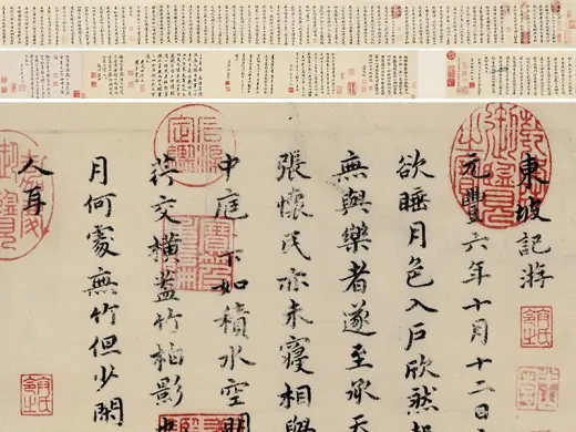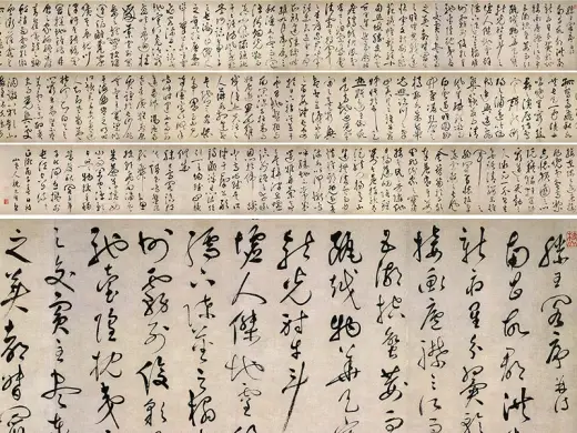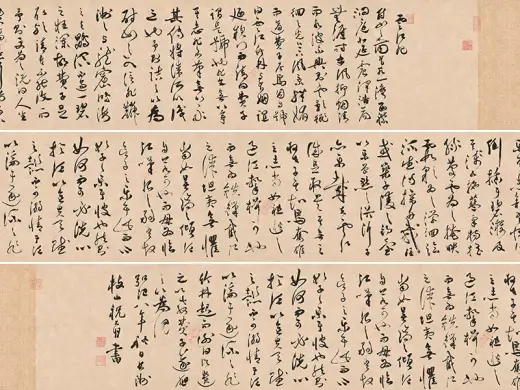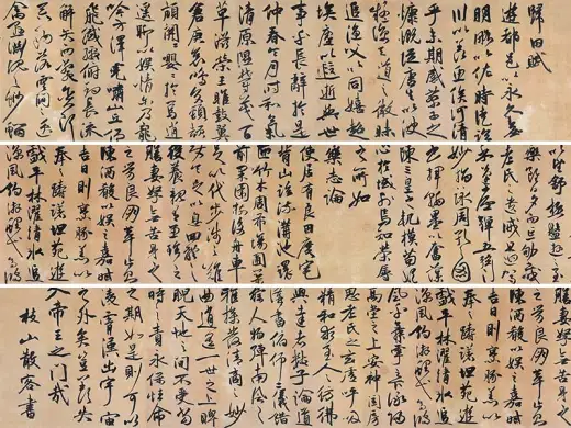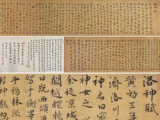祝允明行楷《洛神赋》卷,绢本,纵20.1cm,横161cm。此卷为祝允明四十岁左右师古之作。观其点画、结体,《兰亭》意味极浓,又有钟法存乎其间,淳厚典雅,参以赵孟頫,然变化多致;其行笔从容不迫,笔笔到位,一派君子之风。