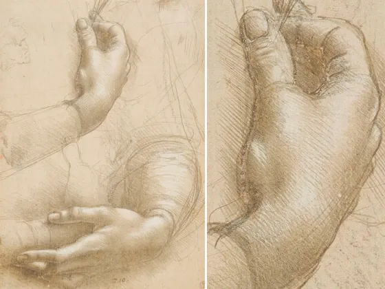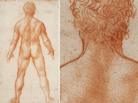 在背部,可以看到斜方肌、背阔肌和竖脊肌;右肩胛骨的下角突出,手臂的肱三头肌突出。列奥纳多专注于捕捉表面造型的微妙之处,用轻微阴影粉笔快速绘制,以及轮廓——尤其是手的透视,是精湛的。这些轮廓是用粉笔轻轻划过而反复绘制的,赋予了一种活力,将图像从静态插图转变为对一个活生生的、会呼吸的个体的研究。