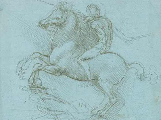 一项研究,从后面看一名裸体男子双腿分开站立的情况。1503 年,列奥纳多开始准备安吉亚里之战的巨幅壁画,该壁画将在佛罗伦萨领主宫的会议厅绘制。列奥纳多为构图准备的图画,描绘了暴力行动中的人和马,使他重新开始对解剖学和比例的长期研究。
