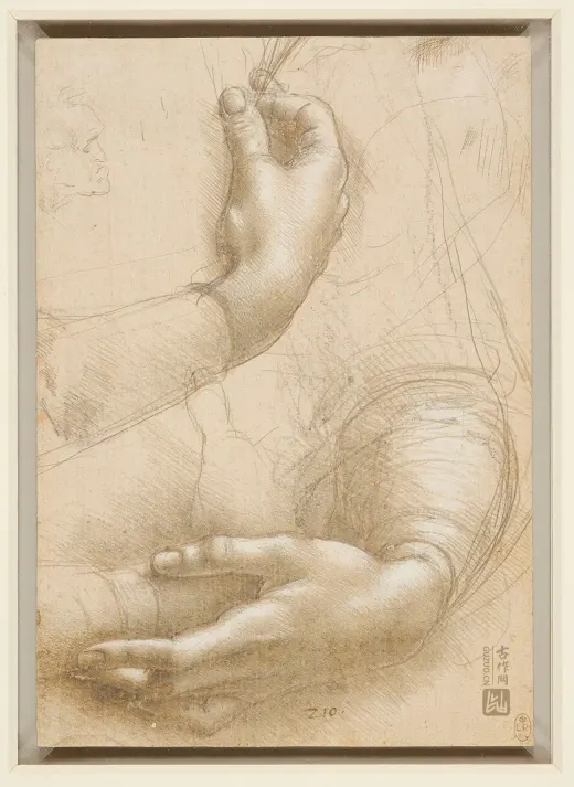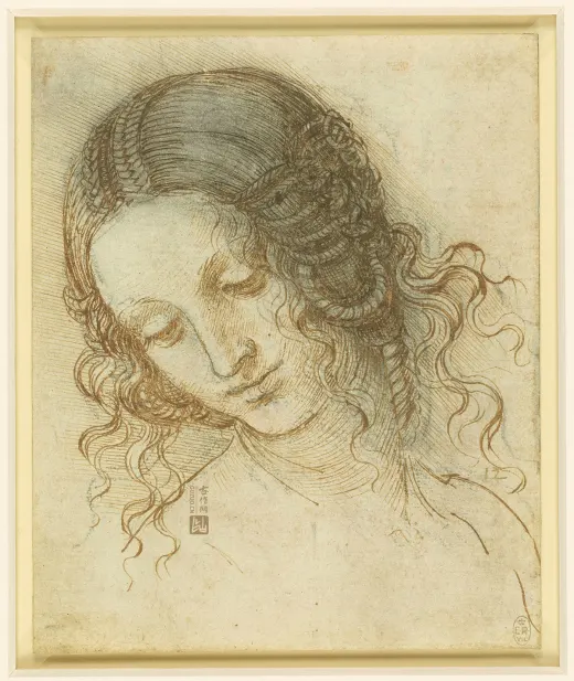 虽然这里的人物形象是莱昂纳多一贯的无牙老人,但他远非可怜。颈部肌肉发达,胡须茂盛,长发盘成辫子,让人想起前十年达芬奇的《丽达》,或者他的大师韦罗基奥多年前的画作。头发表明列奥纳多有意表现出某种异国情调,仿佛这个人是一位魔术师,而明显的鹰钩鼻也符合这种概念。