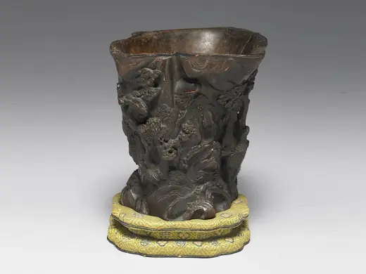 竹雕圆形笔筒,雕刻者利用山石与松树隔成两景,一为室内,一为室外。室内之景运用镂空透雕技法雕出圆窗,窗外横生一枝松树。四位云髻高耸的仕女,一人立于屏风后,右手指著屏风,回首与捧书画卷轴的女子相谈,屏风上阴刻工笔梧桐。一女子手捧如意,与另一侧身女子欣赏瓶荷。室内横陈长榻,室外松石下,三女闲憩,一坐蒲团上吹箫,一背坐石上弹奏,一持扇立松树下。弹奏女子昂首回头。石壁间浅阴刻行楷书「三松」二字款。 朱稚征,字叔子,号三松,可能生于嘉靖三十八年(1559)年左右,卒年不知,基活跃于万历年间(1573-1619),与祖父朱鹤、父亲朱缨三人合称「嘉定三朱」。使得竹刻成为嘉定一邑的特产。这件雕竹笔筒具有朱稚征竹刻作品的某些特征,但可能是后人的冒名之作,也是传世众多「三松」款识作品中难得的精品。