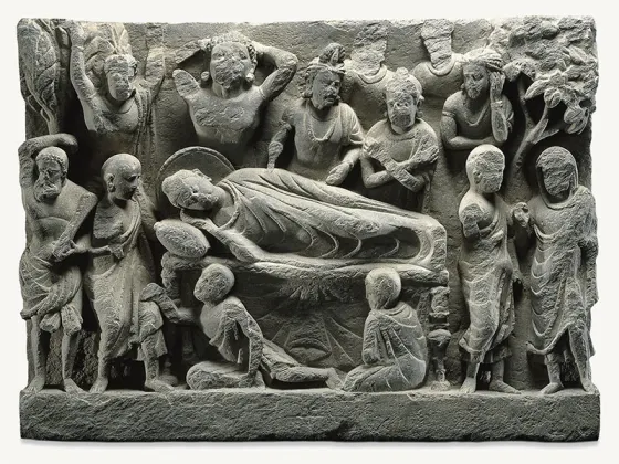 According to Buddhist doctrine, whatever situation we are in at any one time is precisely the result of our previous actions. This principle of karma fits within the grand cycle of samsara, or the vicious cycle of birth, death and rebirth. In every birth there is suffering and it is through one's karma in a human birth that one can transcend the cycle and not be reincarnated.Correct and meritorious action should lead one to nirvana.The Buddhaachieved nirvana meditating under the Bodhitree, a subject that is represented in numerous Buddhist sculptures. This particular relief shows his physical passing from this world, called the maha-pari-nirvana, or the great state beyond nirvana.The figure of the Buddha has been treated quite frontally. The robe that covers his body has regular curves and rounded edges indicating folds of drapery. His calm, haloed face is gently supported by a pillow and his right hand. The grieving figures that surround him include princes, mendicants (beggars) and lay followers. In front of the couch on which he lies are presumably the monk Ananda and nun Subhadra, while Aniruddha stands beside the Buddha's head. The bearded figure with a bare torso standing next to him is probably Vajrapani, the Buddha's guardian spirit.
