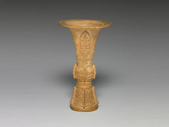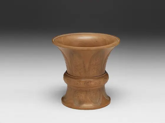 ——竹雕兽面纹觚,雕刻,清,公元18世纪,高18.0 公分、口径长10.8公分、宽9.2 公分、腹径长5.0公分、宽4.7 公分、足径长6.0公分、宽5.0公分,台北故宫博物院藏。