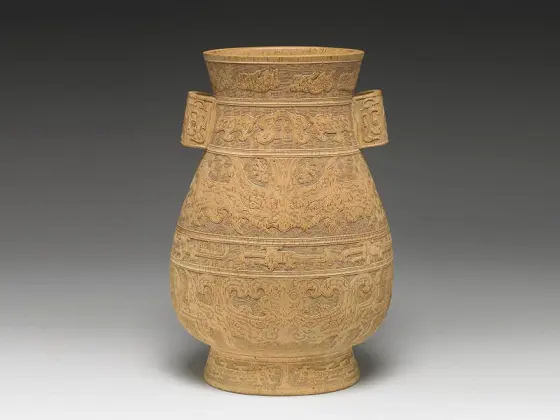此作以竹仿青铜贯耳壶器形,通器阴刻兽面、夔龙及回纹,雕工精致,造型古雅。风格与乾隆时期仿青铜器物相仿,应为乾隆年间作品。竹雕工艺在中国起源甚早,明中叶以后,嘉定、金陵竹雕驰名远近,为文人雅士书斋中常见陈设。竹寓君子,清高宗承此概念,喜好竹制文具、陈设;虽北地种竹不易,内廷却收藏不少竹雕,甚至建三友轩、竹香馆等,显示高宗爱竹之心。当时民间竹木雕刻崇尚工巧,高宗御制诗诟病此风「既伤之俗而反致纤脆易敝」,并提出鉴赏竹制品的标准「不期精细期苍古」,遂产生仿商周青铜器形之竹雕作品。这类仿古竹雕多与《西清古鉴》等宫中图谱所绘青铜器甚为相像,或许是将图谱稿样送交南方竹刻匠人雕制而成。