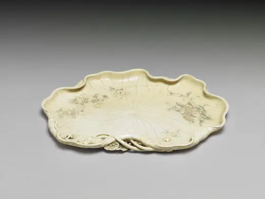 皮胎,圈足,足底髹褐漆,盘沿雕连枝牡丹,花一仰一俯相间排列,两侧各二枝上下交叉,以线条表现花与叶。盘面外沿刻花形菱格带状饰。盘内下沿刻山丘样重复起伏的地面,一棵树伴著一株藤蔓,穿过盘心,向左右分枝,再往上伸展,中心为三粒荔枝,圆周四个位置各二个果实,树干上是波浪状的纹理,底部又无数同心圆似的地纹,再加上扭动的树干和卷曲的枝叶,使盘面充满动感,布局疏密平均,构图稳定,漆色红,漆层薄,漆质坚实,刀法略斜,使规整的轮廓线增加变化,是一件少见的佳品。