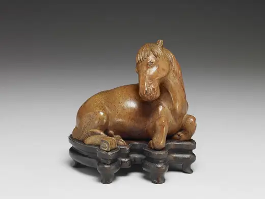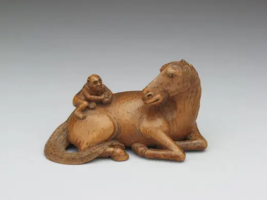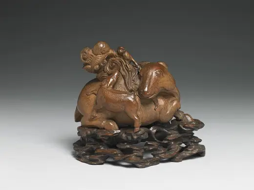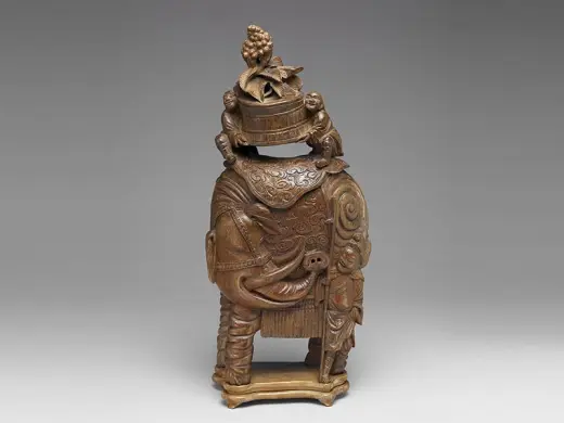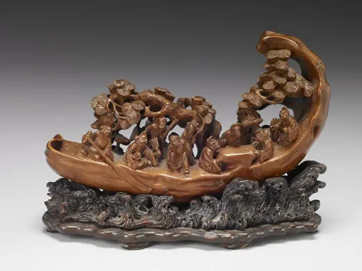 全器取竹子地上茎一节,剖成片状,雕出一士人左手执一舄(重底的鞋子),右肘倚石而立。纹饰的主人翁是东汉明帝叶县县令王乔,河东人,有神仙术,每月朔望常从县衙至京师觐见皇帝。皇帝对他的来去神速又不见车骑,感到奇怪,便密令太史伺望。后来太史回奏:王乔到临时,辄见双凫从东南飞来。于是守候双凫飞临,便张网网罗,仅得一只舄,正是永平四年(61)尚书官署所赐履。有人便以为王乔是古仙人王子乔。后人便借「王乔凫舄」事用为地方官的故实。嘉定竹刻自「嘉定三朱」引领风潮以来,在纹饰内容方面,善用古代文士雅言逸行,或是汉魏六朝的仙释传说,深获当时与后世士人学子的激赏。这件臂搁的题材即是一例。