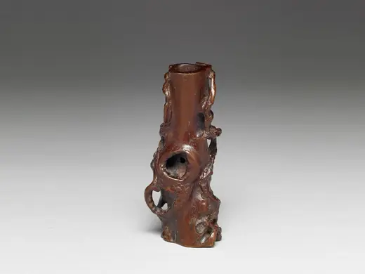 瓶口外翻、长颈、斜肩,腹部上丰下收,底接圈足。颈两侧加饰蓝彩双耳。底面施釉、无款识标记。足底著地处露胎。器表以白地蓝花和蓝地白花穿插为饰。颈外画蕉叶,中心留白。颈肩相接处环绕一圈尖角图案,肩部绕饰一周蓝底白梅冰裂纹,腹部为蓝底白色卍字锦,近底处则接变形莲瓣及圈点纹。从装饰纹样看,中心留白的蕉叶纹自十五世纪已出现,而卍字锦自十六世纪晚期已成为卡拉克样式瓷器上经常可见的装饰元素之一,其表现手法并且可概分成白地蓝花、蓝地白花和模印堆花等不同的式样。至于冰梅纹亦同步流行于十七世纪,以碗礁一号沉船出土品为例,至少存在三种不同的样式。最后回到此品的定年判断,因考虑传世存在一件装饰蓝地白卍字锦纹的瓷盘带有康熙年款,以及康熙朝也生产以铜丝圈绘出冰梅纹图案的掐丝珐琅器,甚至连十二美人图之一的「鉴古」轴中的仕女也穿著印有冰梅纹的衣服。再加上学界亦有将不规则冰裂纹看成是更早的顺治朝纹样等不一而足的观点,遂让笔者将此器看成是十七至十八世纪产物。同时透过留白蕉叶纹和卍字锦也出现在十七世纪末的伊万里瓷器,进一步揭开因应西方市场的需求,中、日双方既回荡一股相互竞争、彼此消长的态势,也酝酿出共通的装饰风格。(取自《亚洲探险记:十七世纪东西交流传奇》)