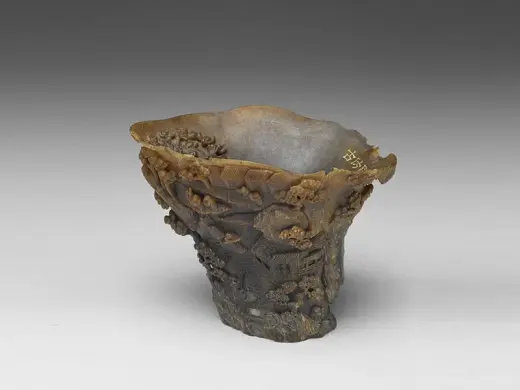 全器切取犀牛角雕制而成,剖面略呈椭圆形,侈口,深壁,上丰下削,平底,口缘有伤缺,呈浅褐色,口缘以下即呈深褐色,底部近于黑色。器外壁满雕仙山楼阁,树木错落,得道仙众三五成群,于仙山中谈经论道;一窄侧面高浮雕山石与树木以略示出器之鋬。口缘内壁一侧浮雕正龙蟠坐于浮云间,另一侧阴刻填金隶书款识:「大清乾隆仿古」六字。器底阴刻楷书清高宗御制诗文,曰:「仿古原非远古时,宣城规制进犹遗。切磋写出溪村景,淇澳风人喻有思。」下接楷书款:「乾隆辛丑御题」,篆书印:「古香」。乾隆辛丑即乾隆四十六年(1781),此诗亦收录于《清高宗御制诗文全集(八)‧御制诗四集》卷八十一‧辛丑,「题仿古犀角杯」条。