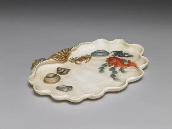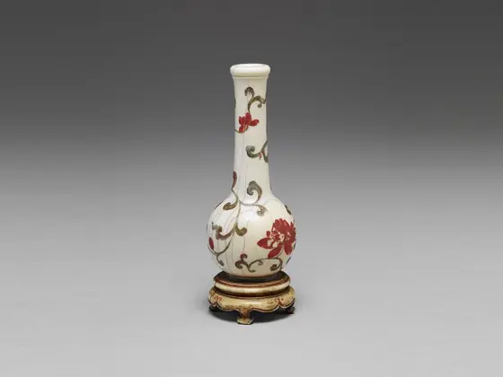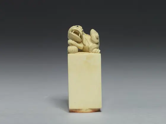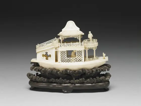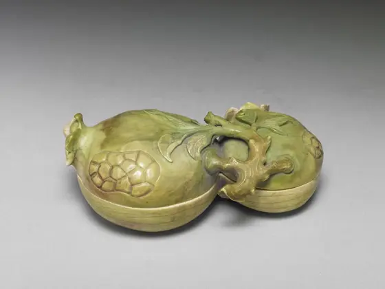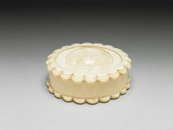 海棠形象牙小盒,盖面镂雕连锁花卉纹,器壁镂雕古钱纹,为象牙长方套盒中的一件。内装一只象牙小壶,壶带盖,以链相连,有双耳活环,腹部浮雕一寿字,套盒全器共十一个象牙盒,其中大小形状不同的十个小盒,皆需装入最大盒中,十个小盒或附果盘,或连链附动物、瓜果,或仅连链而以镂空葫芦形小牙饰、磬形小牙饰连接,形形色色,不一而足;其中有数个小盒之盖面、器身饰镂空活纹。最大盒器身底面阴刻填黑楷款:「乾隆己未巧月,小臣黄振效恭制。」乃在乾隆四年七月完成的作品,原为「『集琼藻』多宝格」中的文玩之一。黄振效这种连链、活纹小盒(尤其是套盒)乃广东牙匠的绝活,实可谓集精镂细刻之极致。