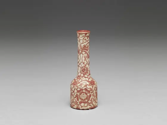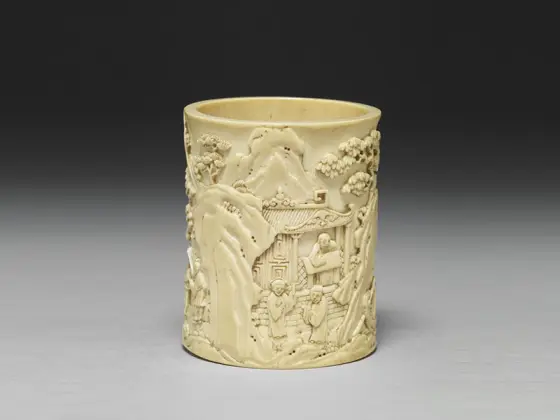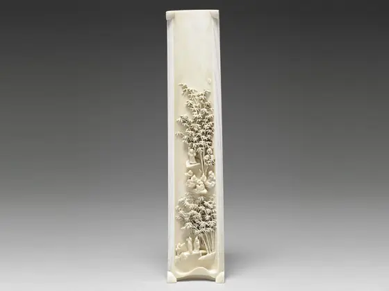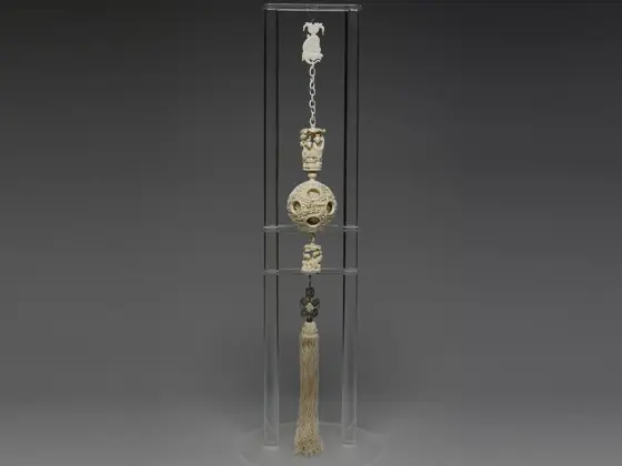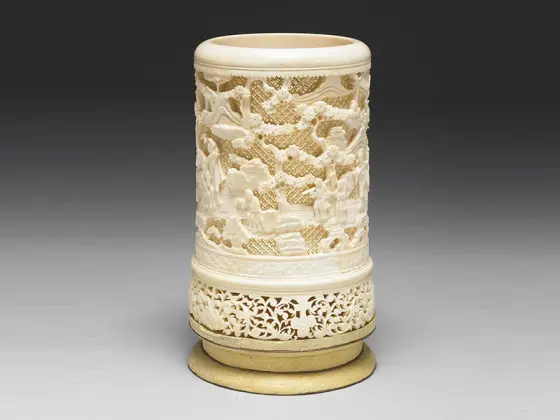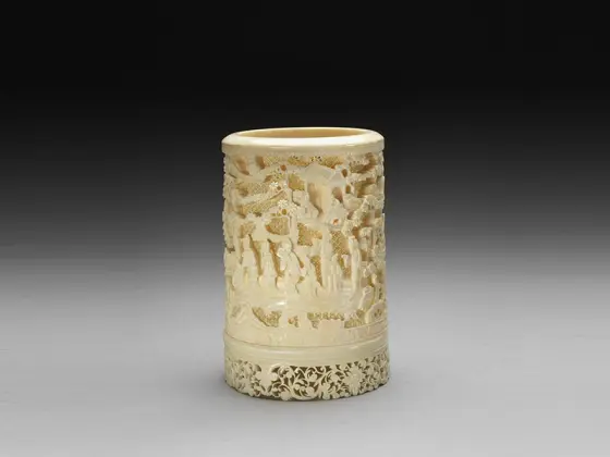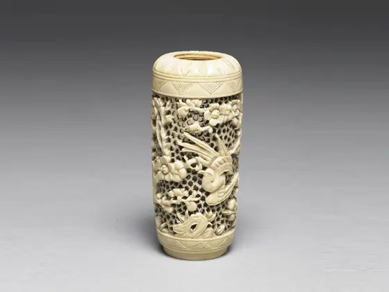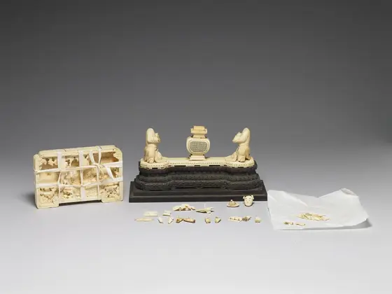 ——象牙雕透花长方套盒,雕刻,清代乾隆四年,1739年,盒长1.3公分、宽1.3公分、高0.6公分、壶雕件高约0.8公分,台北故宫博物院藏。