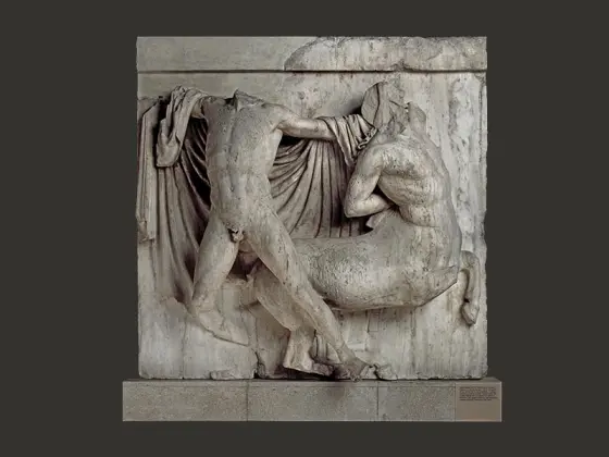 ——帕特农神庙的雕刻装饰包括九十二个墙面,展示了神话般的战争场景。神庙南侧的一系列作品展示了人类拉皮泰人与半人马的殊死搏斗。半人马一半是人,一半是马,因此他们的本性既有文明的一面,也有野蛮的一面。邻近的希腊部落拉皮特人在半人马国王佩里图斯的婚宴上犯了一个错误,给半人马喝了酒。半人马试图强奸这些妇女,他们的首领欧律提翁试图夺走新娘。随后发生了一场全面的战斗,拉皮特人最终取得了胜利。 图中,年轻的拉皮人用一只手从后面抓住半人马,同时准备用另一只手进行攻击。构图完美平衡,主角们围绕着一个由拉皮斯斗篷的层叠褶皱填充的中心空间向相反的方向拉动。