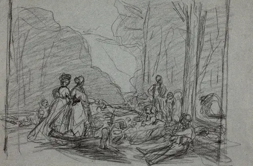 在这幅横向的风景画中,我们的目光越过波光粼粼的河面,望向对岸的码头、十余艘小船,以及一座芥末黄色的方正建筑。建筑上方,一座桥梁横跨整个画幅。画布右下角,一片青草地沿着河岸蔓延。陆地蜿蜒延伸至视野之外,又在画面右侧的桥墩下方重新进入画面。从象牙色的桥墩开始,笔直的桥面由两道浅拱形的铁灰色桥拱支撑,并向构图左侧延伸开去。桥面上点缀着红色与灰色斑点,暗示着车辆或行人往来。桥下的河面泛着银灰、冰蓝与淡紫灰交融的笔触,几艘低舷帆船点缀其间。一艘蓝绿色的船屋停靠在画面右侧的河岸边。那座长方形的平顶建筑开有两层窗户,云杉绿的窗框映衬着金黄色的墙体。地平线恰好位于桥面下方,居于画幅中部偏上位置。上方的天空以乳白与烟灰色的长笔触挥洒而成。整个画面可见松散短促的笔触,尤以水面、船只与桥身最为明显。艺术家在右下角签署:“克劳德·莫奈”。