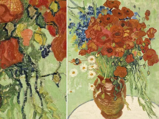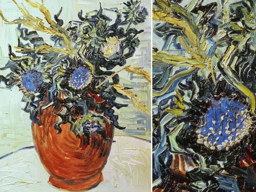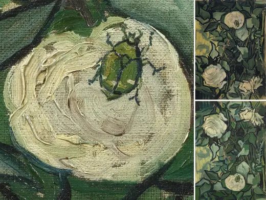 Sitting on a leaf at the bottom of the picture is an insect, depicted far more precisely that the rest of the picture. It is a rose chafer beetle (cetonia aurata), complete with the distinctive white stripes on its underbelly and barbs on its legs. Van Gogh hadsketchedthe beetle earlier and probably traced over his sketch when making this painting.