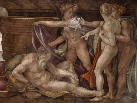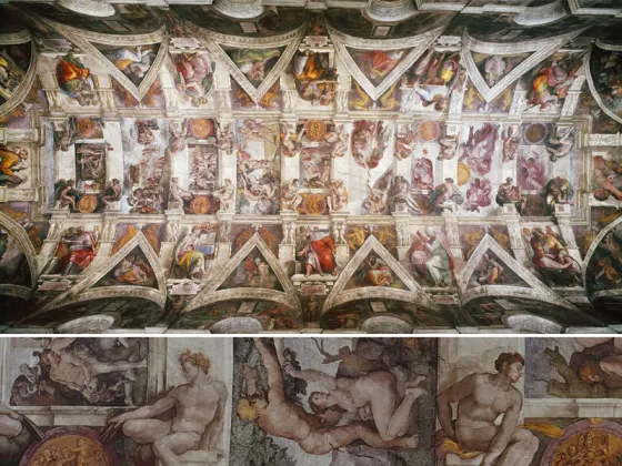米开朗基罗奋力解决画中人物在从下面仰视时所应呈现的比例这一难题。他将上面的人物画得大些,底部的小些,以适应自下而上的观赏效果。