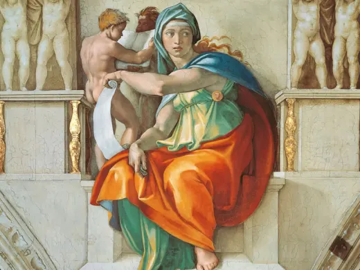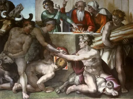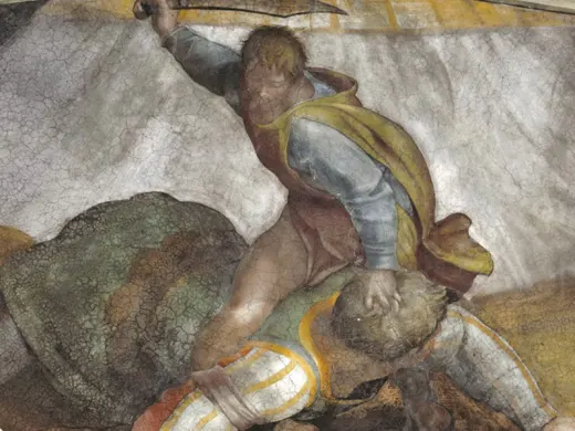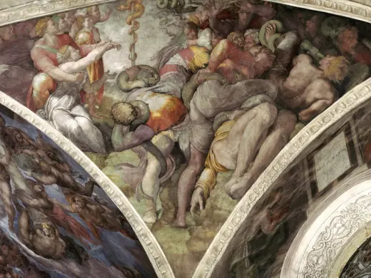 西斯廷教堂天顶壁画 “The Punishment of Haman” "哈曼的惩罚"。这是米开朗琪罗在西斯廷教堂天顶上创作的一幅壁画,描绘了《以斯帖记》中的故事情节。哈曼是波斯王宫官员,计划灭绝犹太人,但最终被王后以斯帖阻止,并受到了惩罚。这幅壁画生动地展示了这个故事中的关键时刻,体现了米开朗琪罗卓越的绘画技术和情节表达能力。