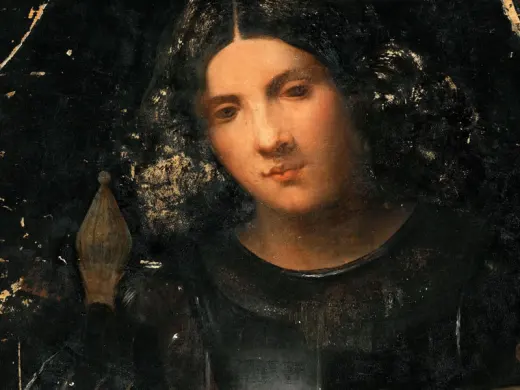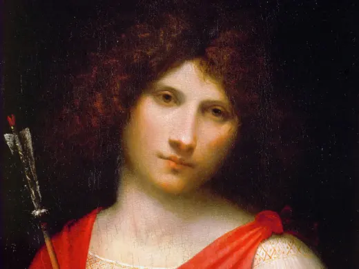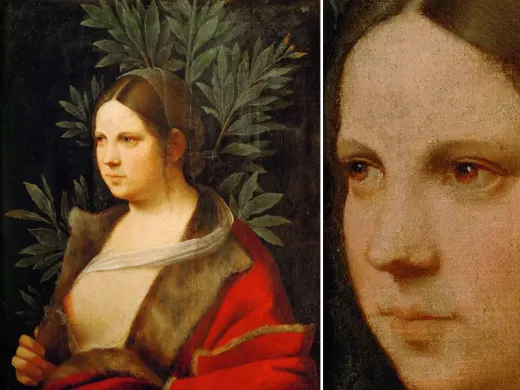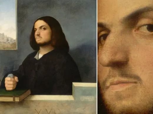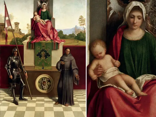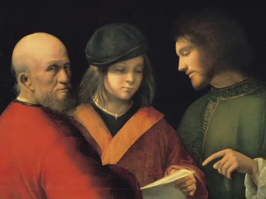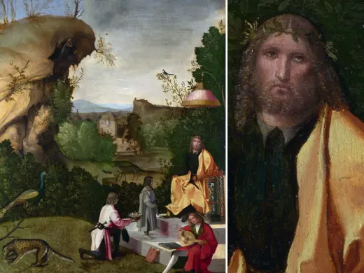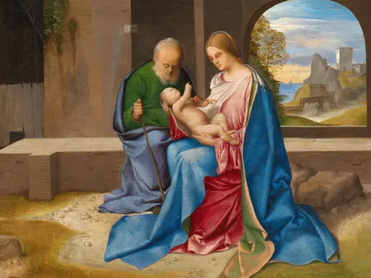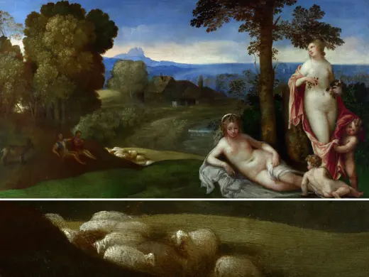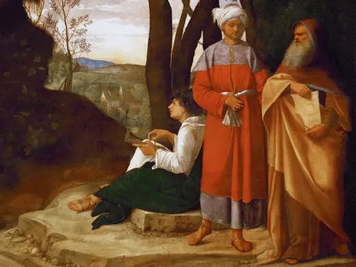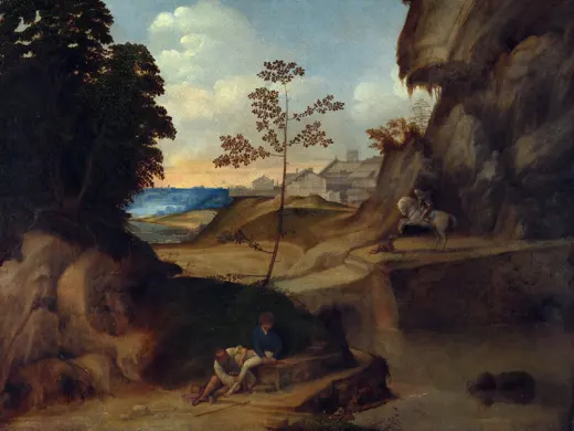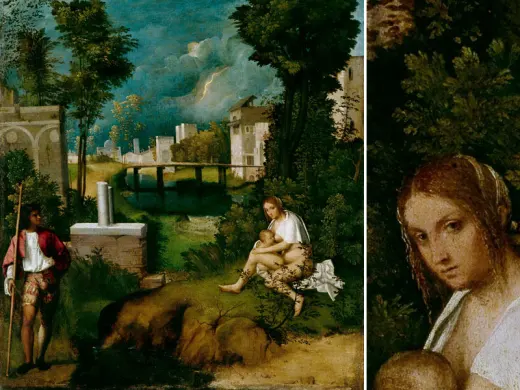 Apart from his larger commissioned works, most of what Giorgione painted was smaller paintings, designed for personal collectors to keep in their homes. This is one such piece, measuring 33 by 29 inches, commissioned by Gabriele Vendramin, a Venetian noble. It is said to be the first landscape in Western painting, and its symbolic implications are up to determination, as there have been many differing interpretations of its meaning. While some interpretations go so far as to indicate that the man and the woman represent Adam and Eve, the sucking babe Cain, and God in the form of lighting and the coming storm, others see no meaning in the work, and state that Giorgione had no particular story in mind while he was completing the work.