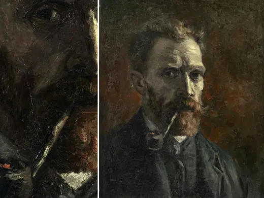 梵高于割耳事件后,增画过数张包着伤口的自画像。这幅画中橙红绿三色产生活泼的色彩效果。叼着烟斗的梵高神情有些呆滞。袅袅白烟对画面中因为色彩浓重而产生的压迫感,有减轻的作用。