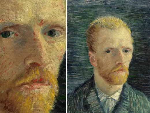 虽然幅自画像似乎完全是一幅传记式作品,可是它所表现的却并不仅仅是画中人的"创伤",还表现了两位画家之间"十分激烈"的争论(L564),即梵高和高更之间对画家的地位、绘画的方法以及象征的风格等方面争论。将它与1889年高更的一幅象征主义"自画像"进行一下比较,问题就会显得更清楚。在高更那幅自画像里,不但有抽象的彩色平面和曲折盘绕的线条,还有人们所熟悉的有象征意义的饰物——苹果、百合花、毒蛇、光环,所有这些便将画家定位为多愁善感的人,他头上披着头罩似的黑发,头顶悬着光环,象征着人物徘徊于善恶之间。高更的这幅作品在风格既有激进的色彩又有传统的痕迹。如果说乍看之下的印象来自画面装饰性的构图,我们最终还是可以辩认出其象征意义。但是梵高在他这幅自画像里则是把有象征意义的色彩和构图与自然肖像画法结合起来,实践了传统风格新探索的合成。不过,这幅作品的生动性深刻含义并非来自善与恶等象征性的表现手段,而是来自衬托受伤者漠然平静神态的热烈色彩和气氛紧张的构图。