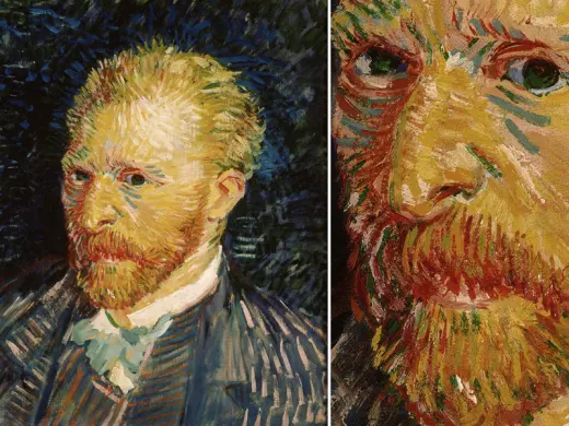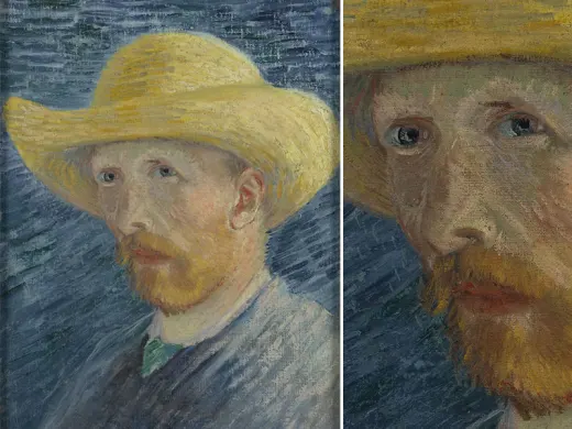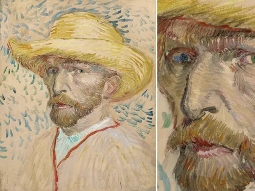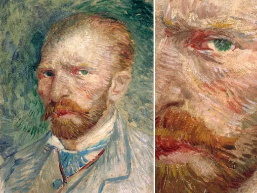 值得注意的是,梵高在抵制受苦难的画家的形象,考虑到他的病史,这是不难理解的。这幅自画像是梵高在自己割下左耳后不久创作,尽管从画面上看其伤势严重而显著,可是这幅自画像却没有受苦难的画家的迹象。6个月前,梵高曾把自己描绘为牧师或者僧人,而在这幅作品中,他恢复了更为平实的身份。他穿着工人的上衣、戴着皮帽子,看不出精神错乱或痛苦的痕迹,即便遭受着身心痛苦的折磨,他也是表现得不以为意,还从容地吸着烟斗。然而画面却度溢着紧张的气氛。帽子上一簇簇的深青色毛直立着,被桔红色的背景衬托得格外醒目,似乎象征着充沛的精力。背景以靠得很近的两只眼为轴线分为桔红和鲜红上下两色,因而也反画面和物分成了上下两部分。在这条轴线下面,鲜红的背景、绿色的上衣、包伤的绷带配在一起显得十分刺眼。其效果是造成了种独特的矛盾,这是作者有意运用的一种视觉矛盾手法,表现出一个沉思的受伤男人为抵御发烧而把自己紧紧地裹在皮帽和衣服里。