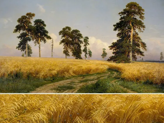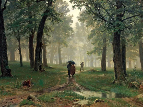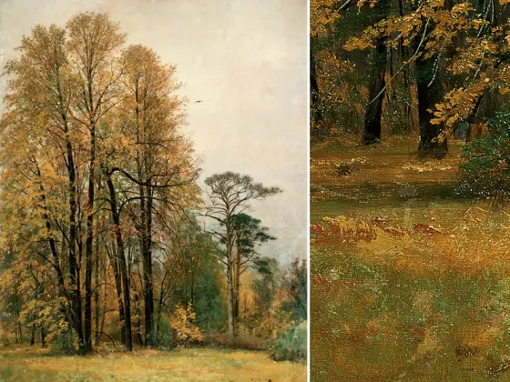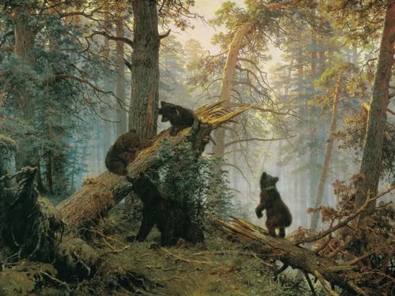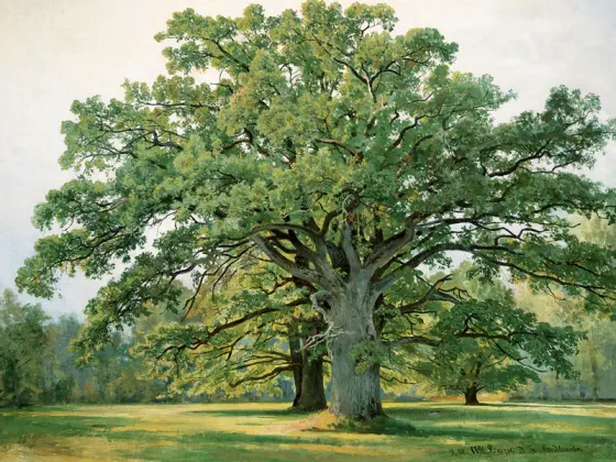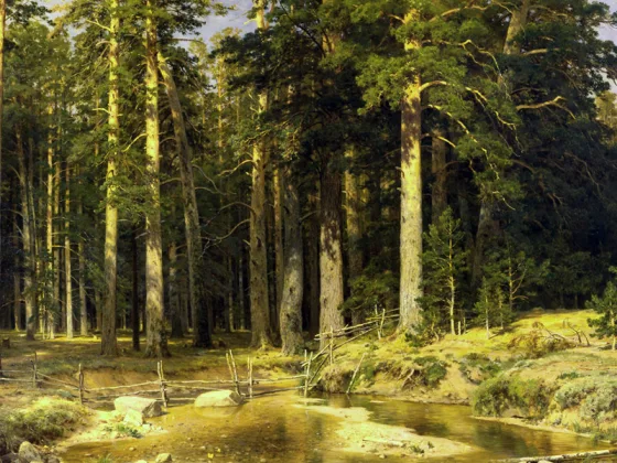 希施金的风景画多以巨大的、充满生命力的树林为描绘对象,那些摇曳多姿的林木昂然挺立,充满生机。繁木菁林,疏密有致,大森林的美与神秘,被渲染得淋漓尽致,可谓美不胜收。希施金所描绘的林木,无论是独株,还是丛林都带有史诗般的性质。林木的形象雄伟豪放,独具个性,显示出俄罗斯民族的性格。他一生为万树传神写照,描绘俄罗斯北方大自然的宏伟壮丽,探索森林的奥秘,被人们誉为“森林的歌手”。