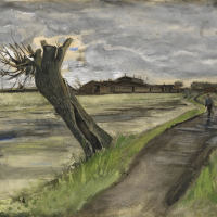 梵高水彩画《乡村的道路与柳树桩》